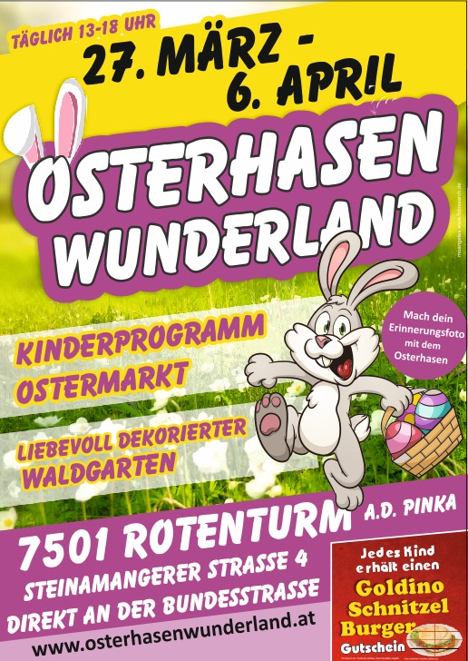 Ein magischer Ort für Familien in Rotenturm an der Pinka im Südburgenland. Tradition und Brauchtum erleben in der heutigen, oft viel zu hektischen Zeit. Das Osterhasen Wunderland will diesem Zeitgeist Rechnung tragen und freut sich auf alle neugierigen Gäste, die den Osterhasen besuchen und sich auf die Suche nach Ostereiern begeben wollen. Weitere fröhliche Infos auf www.osterhasenwunderland.at